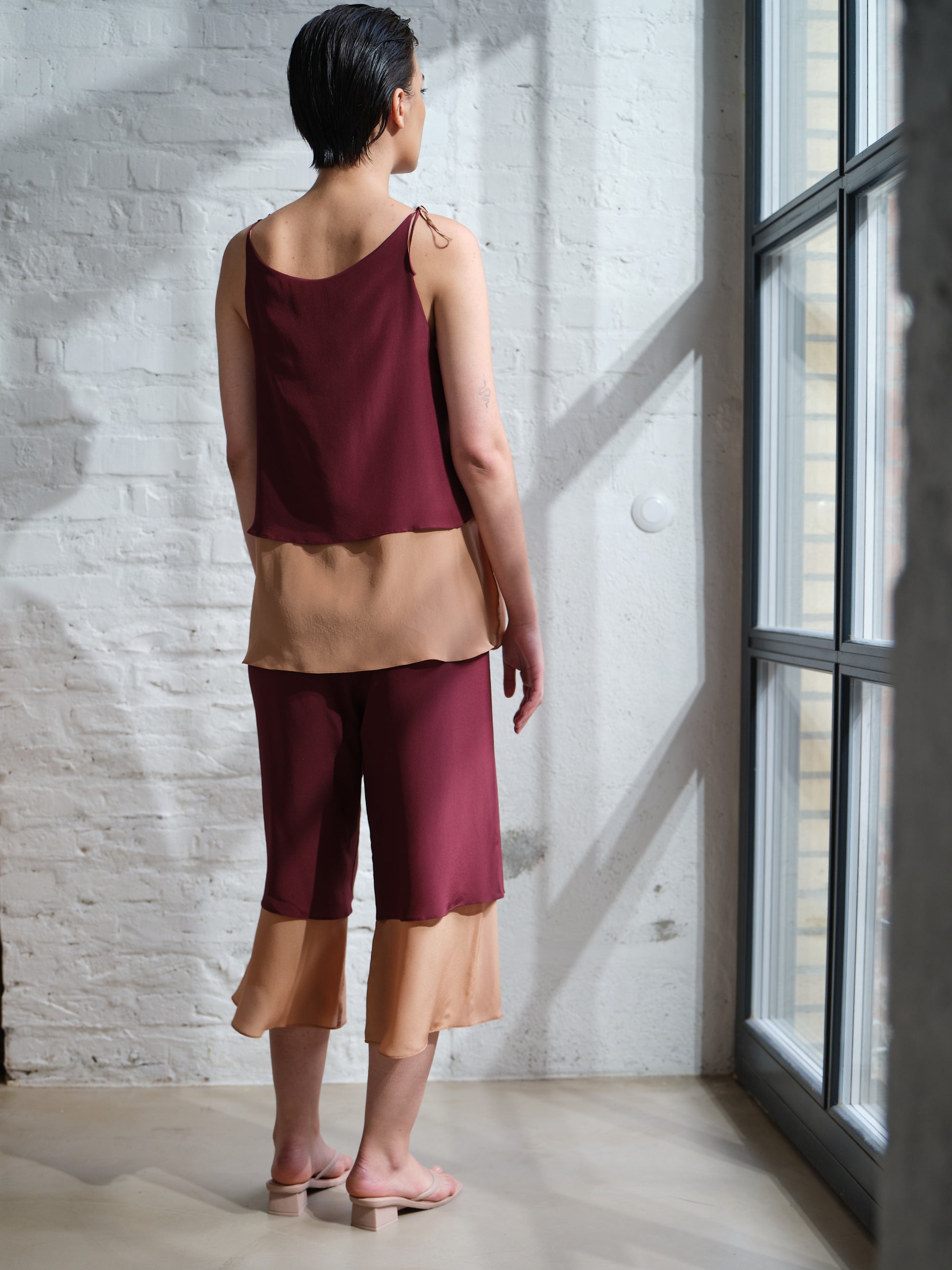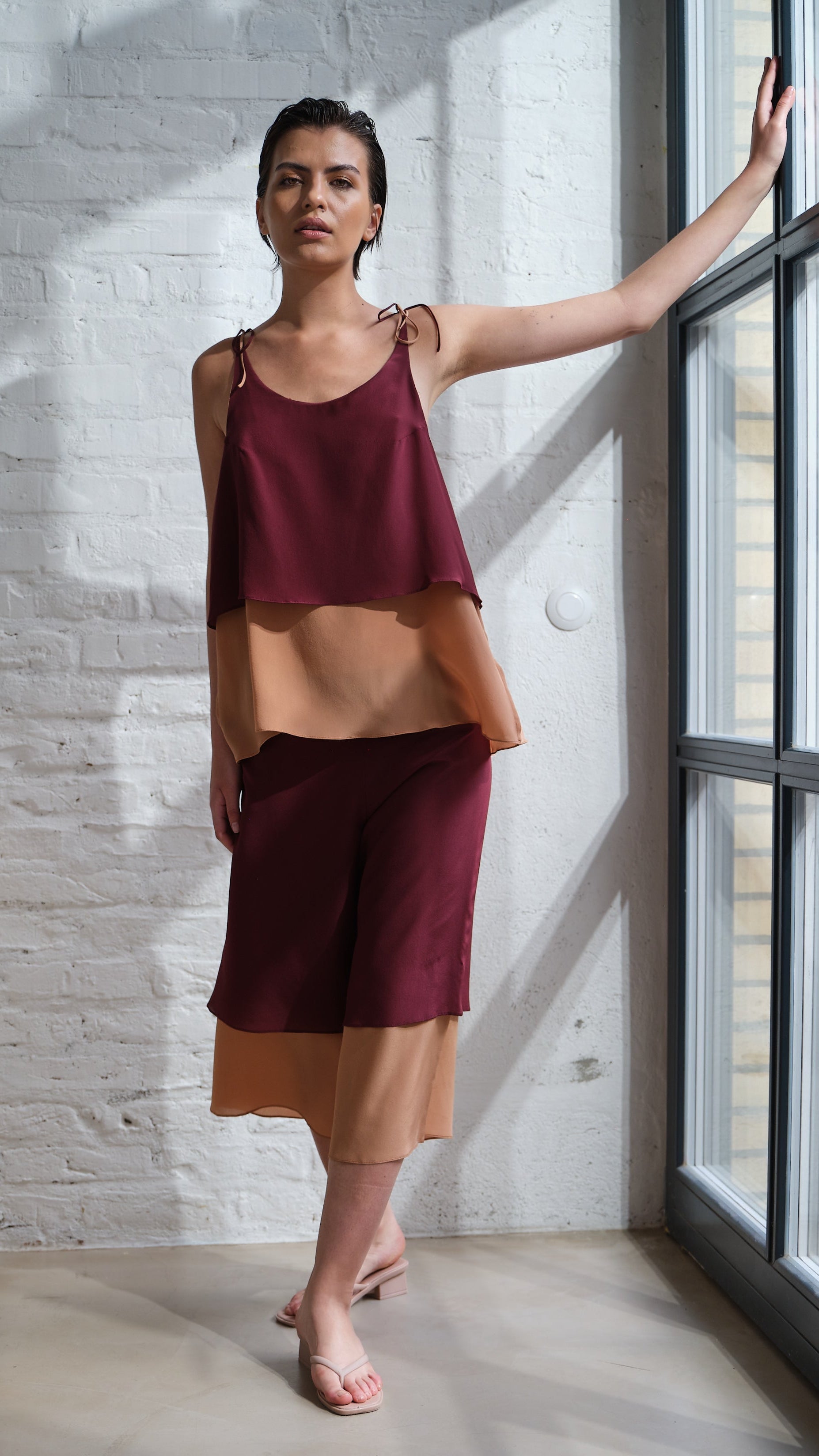 Flirty culottes, layered silk, reversible with the other side revealing a single colour. Perfect for cocktail hour.